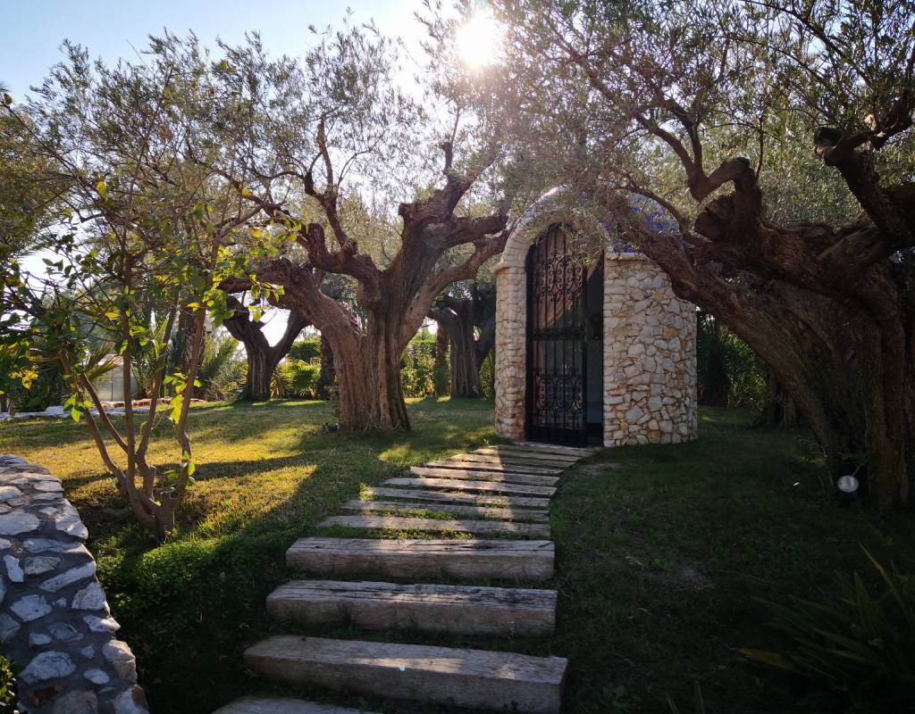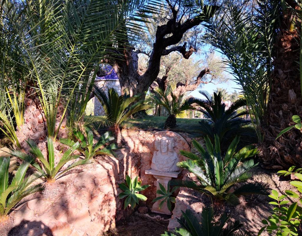 El Jardín cuenta con una superficie de 8000m2 de césped, con caminos de piedra natural, varios tipos de árboles, dos pozos de agua salmalla.