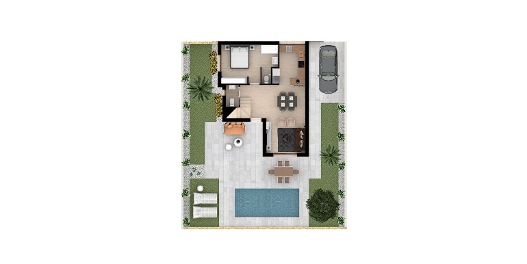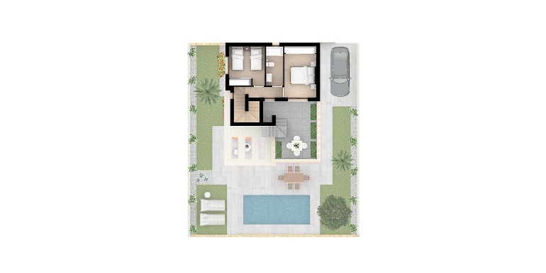 Estas viviendas de 3 habitaciones son amplias y luminosas, tienen dos plantas y están ubicadas alrededor de una piscina privada con una gran terraza.