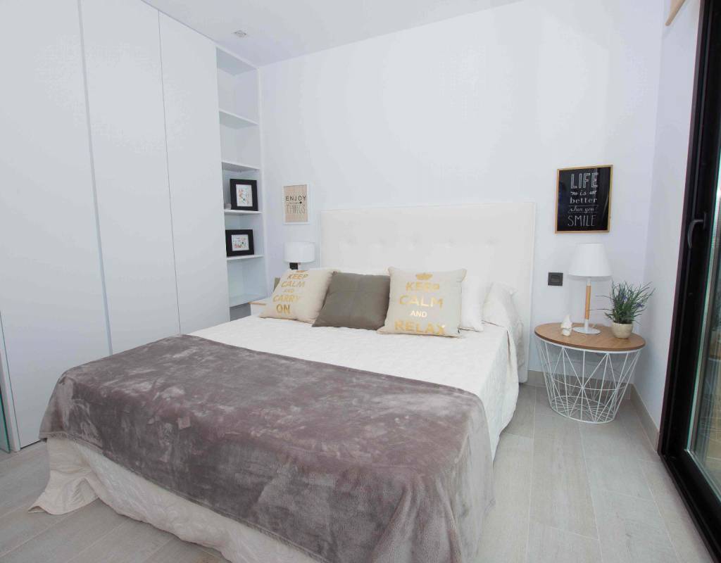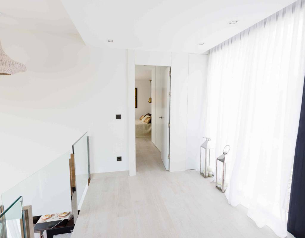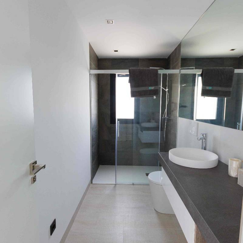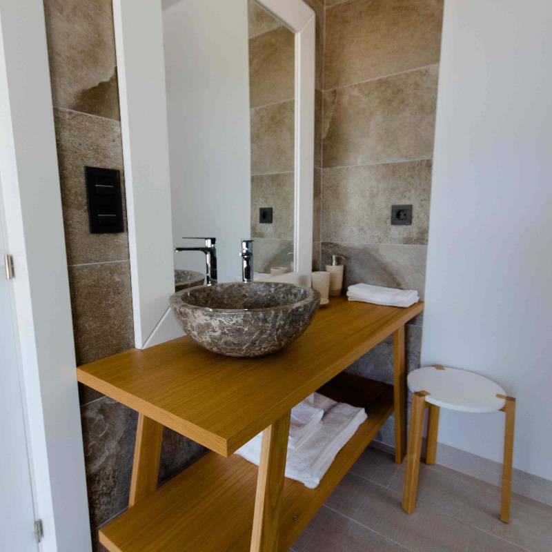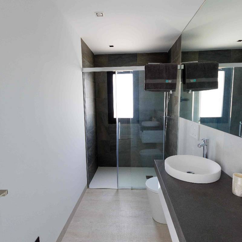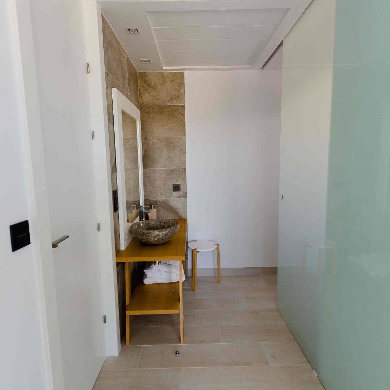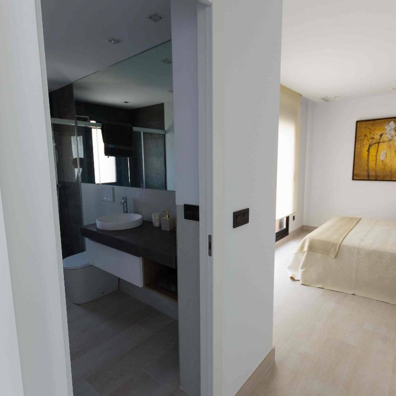Está distribuida en dos plantas. En la superior se encuentra el acceso a la vivienda a nivel de calle, donde se encuentran dos habitaciones suite, una de ellas con terraza. En la planta inferior, encontraremos una habitación de matrimonio, un cuarto de baño, un luminoso salón comedor, con amplios ventanales y acceso directo a la piscina y jardín.