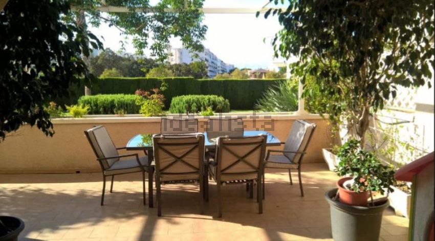 "Bajo con jardín en la zona del campo de Golf, en perfecto estado. Consta de dos dormitorios -uno de ellos en suite con armarios empotrados y dos baños completos. Cuenta con cocina independiente equipada, con lavadero acristalado. Amplio salón comedor. Dos terrazas de 30 m2. Aire acondicionado frío/calor por conductos en toda la vivienda. Carpintería interior de roble y exterior de aluminio climalit. Urbanización con piscina y zona verde. Plaza de garaje. Cercana a todo tipo de sevicios y comunicada por transporte público."