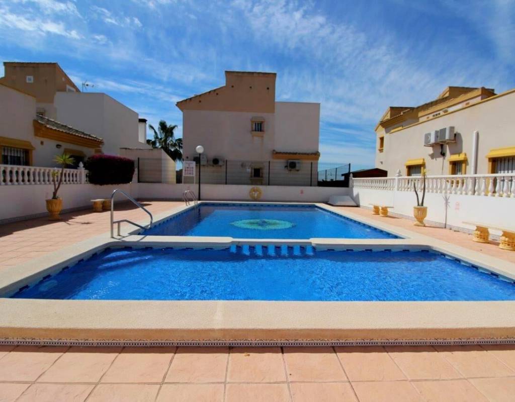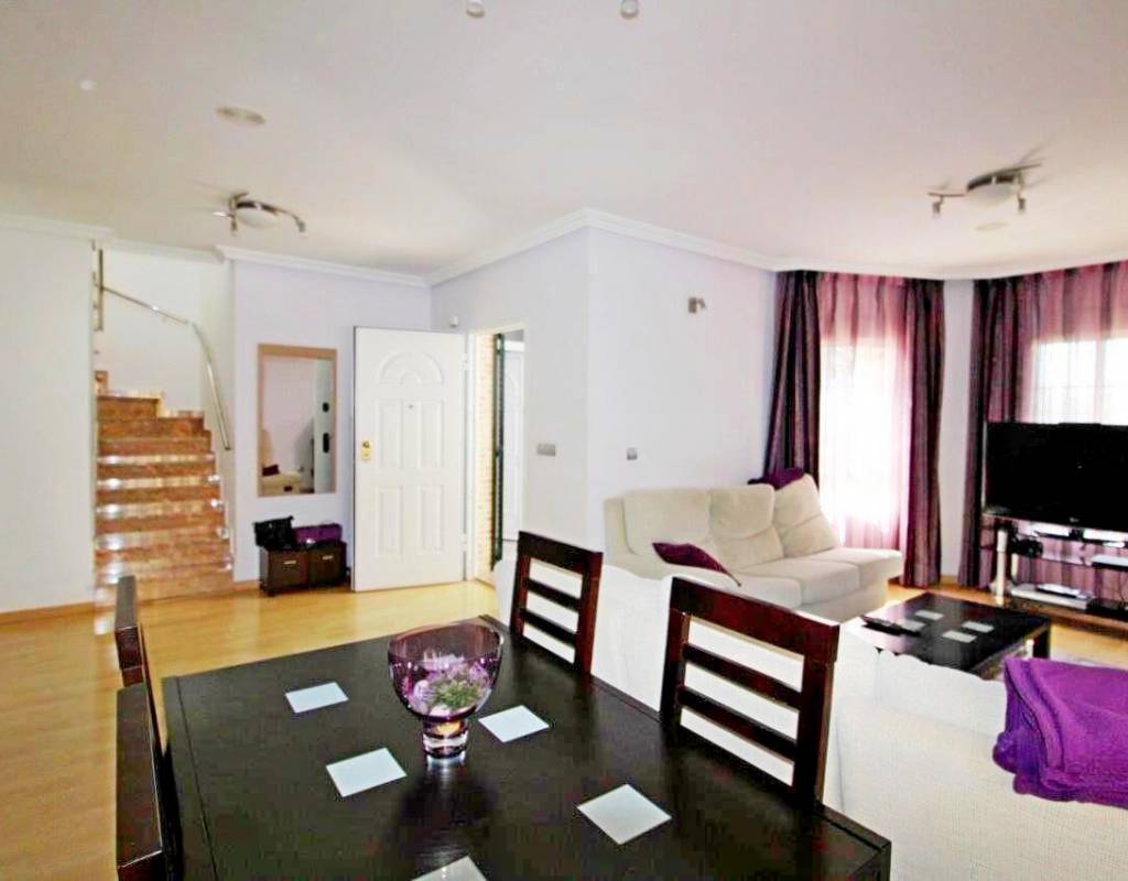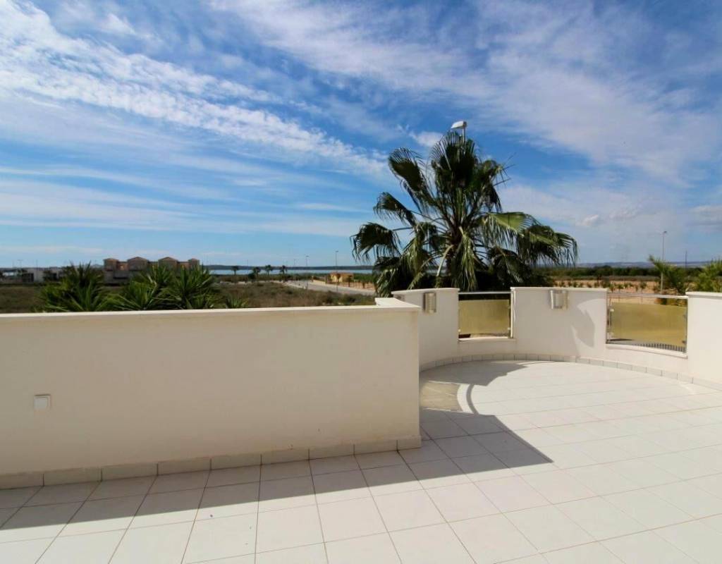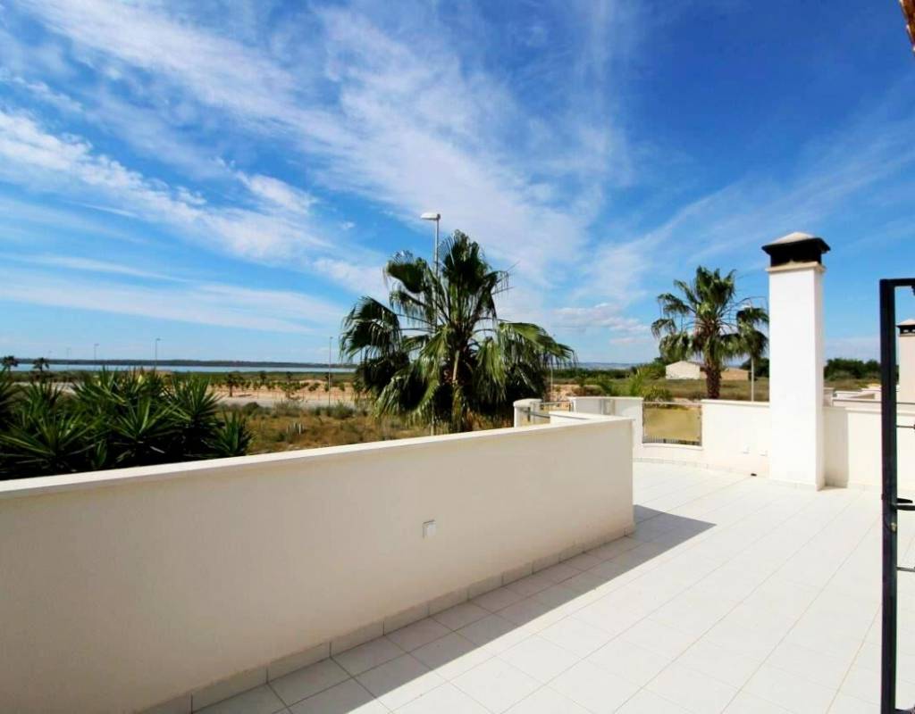 La casa es de aprox. 96 m2, dispone de 3 dormitorios y 2 baños. En la planta baja hay 1 dormitorio, una sala de estar dividida en dos áreas diferentes con vista al jardín, cocina amplia y luminosa y 1 baño. En la 1ª planta encontrará 2 dormitorios con acceso a una gran terraza y 1 baño. Solarium de 28 m2 con vistas despejadas sobre la laguna. La Propiedad también disfruta de uso de la piscina comunitaria. Se vende en excelentes condiciones y listo para entrar a vivir. La propiedad se encuentra a solo 10 minutos de las playas con bandera azul de Guardamar del Segura y a menos de 20 minutos de algunos de los mejores campos de golf de la zona.