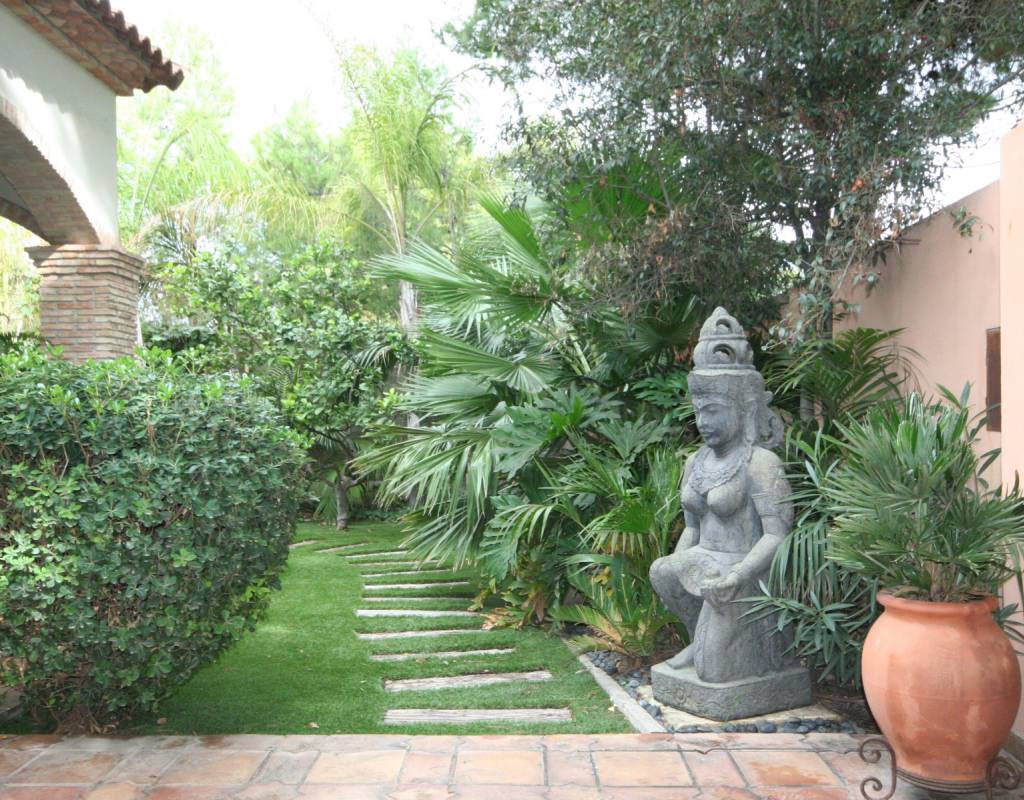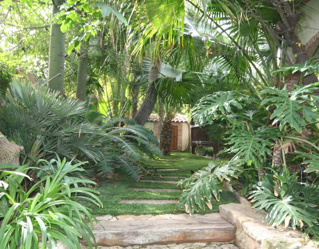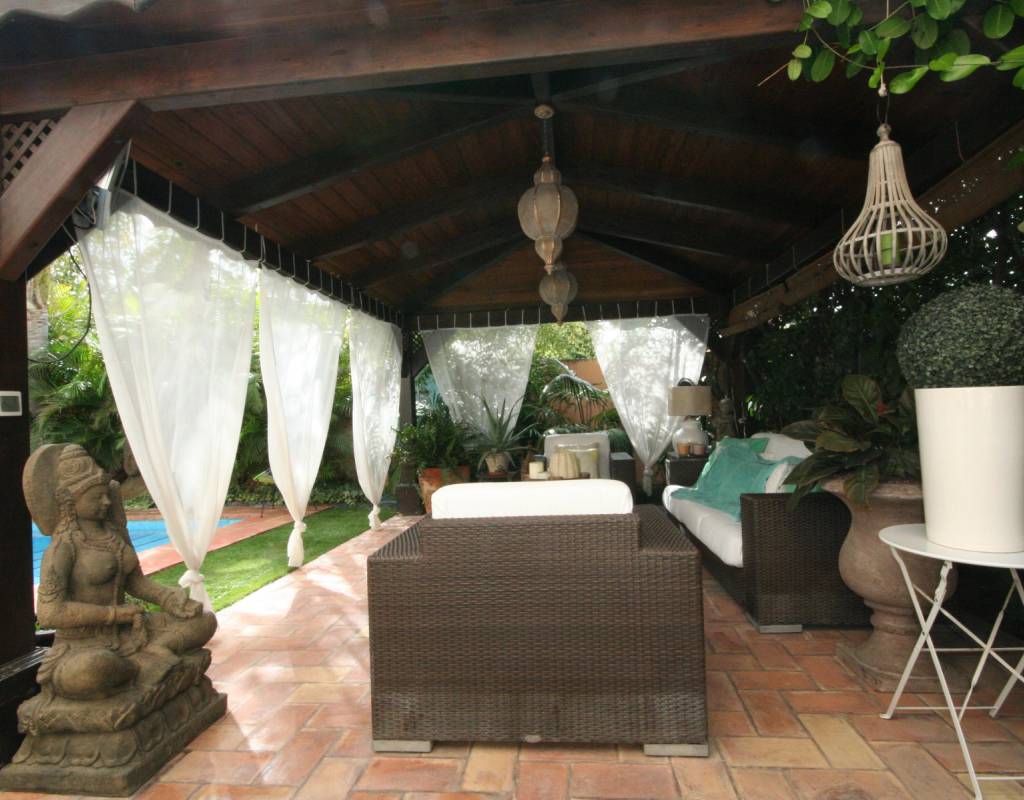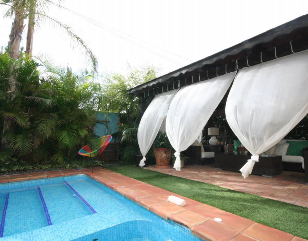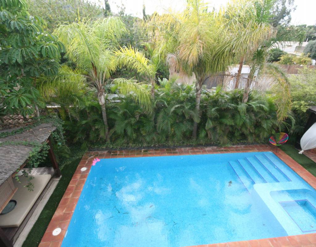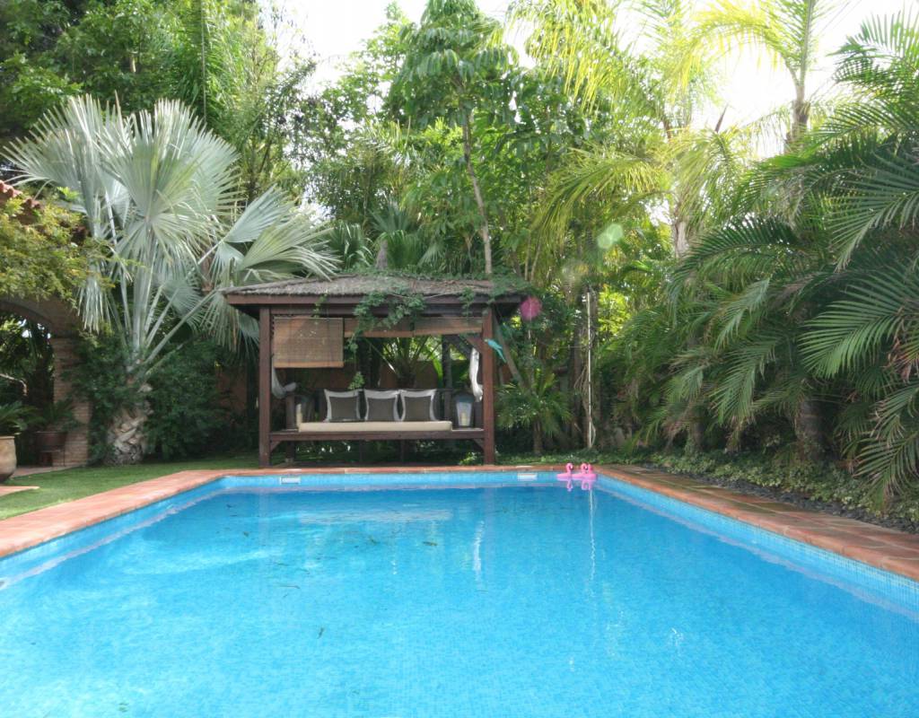En zonas ajardinadas preciosa piscina, con jacuzzi para 8 personas, cenador y cama balinesa