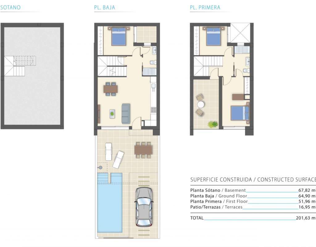 Amplias viviendas distribuidas en 2 plantas y con un sótano; Tienen 3 dormitorios y 2 baños, amplio salón comedor abierto con cocina moderna tipo francesa.