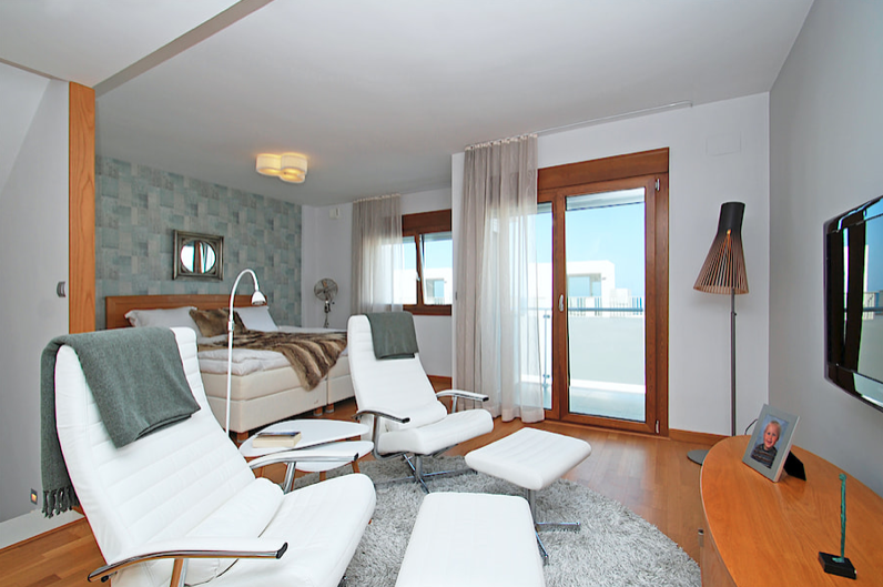El salón principal ofrece una gran cocina francesa y un amplio salón - comedor con acceso a la terraza. En la planta superior se encuentra el dormitorio principal y 1 baño,que tiene acceso al amplio solarium con impresionantes vistas panorámicas al mar.
