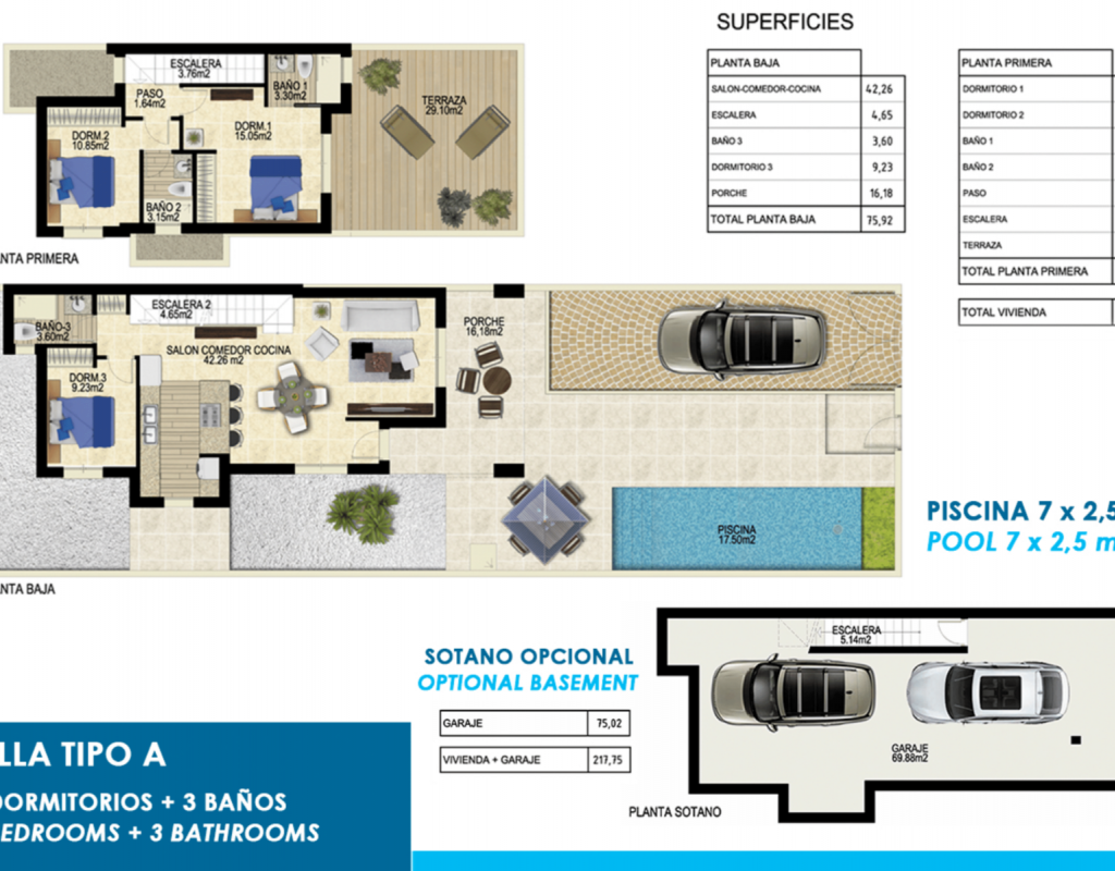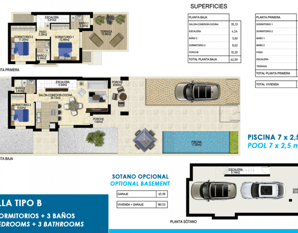 Elegantes villas nuevas de aproximadamente 143m2 distribuidas en dos plantas; Consta de 3 dormitorios, 3 baños, amplias zonas de estar y cocina abierta.