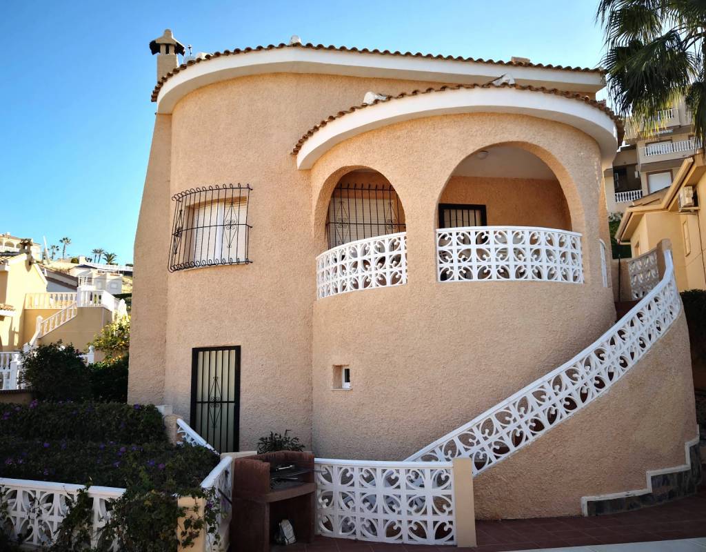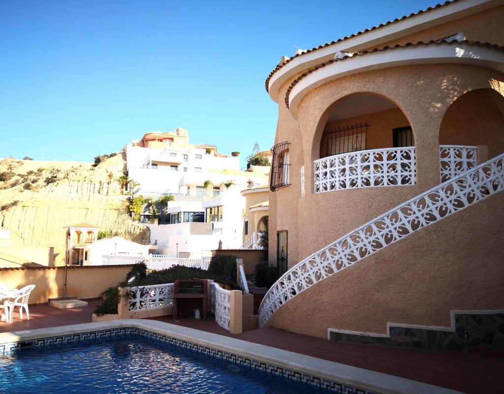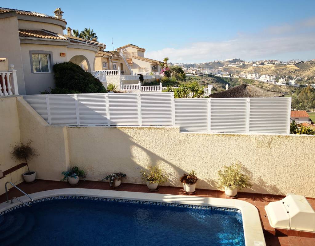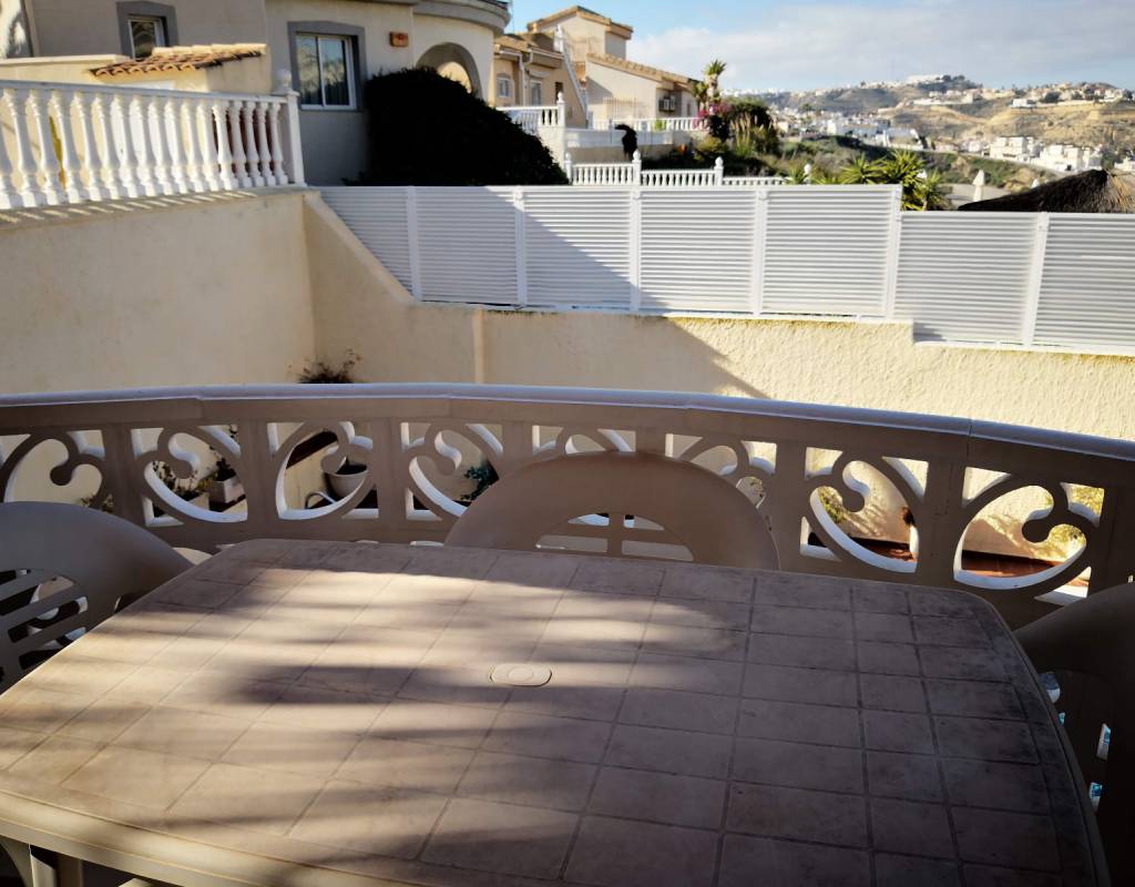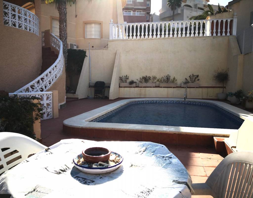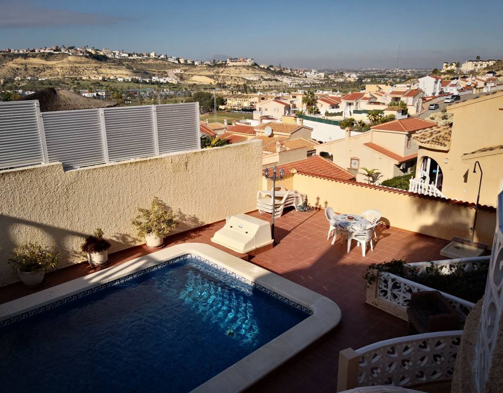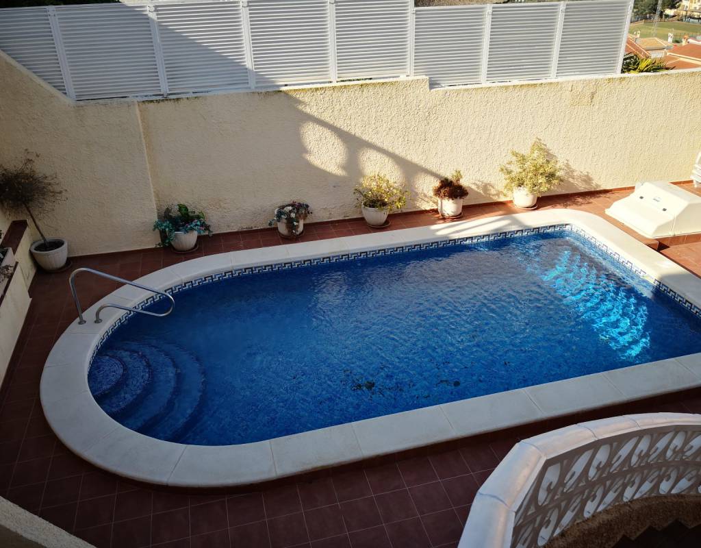 Amplia villa situada en una parcela privada de aproximadamente 400 m2 con piscina, terraza y patio, ideal para tomar el sol todo el día.