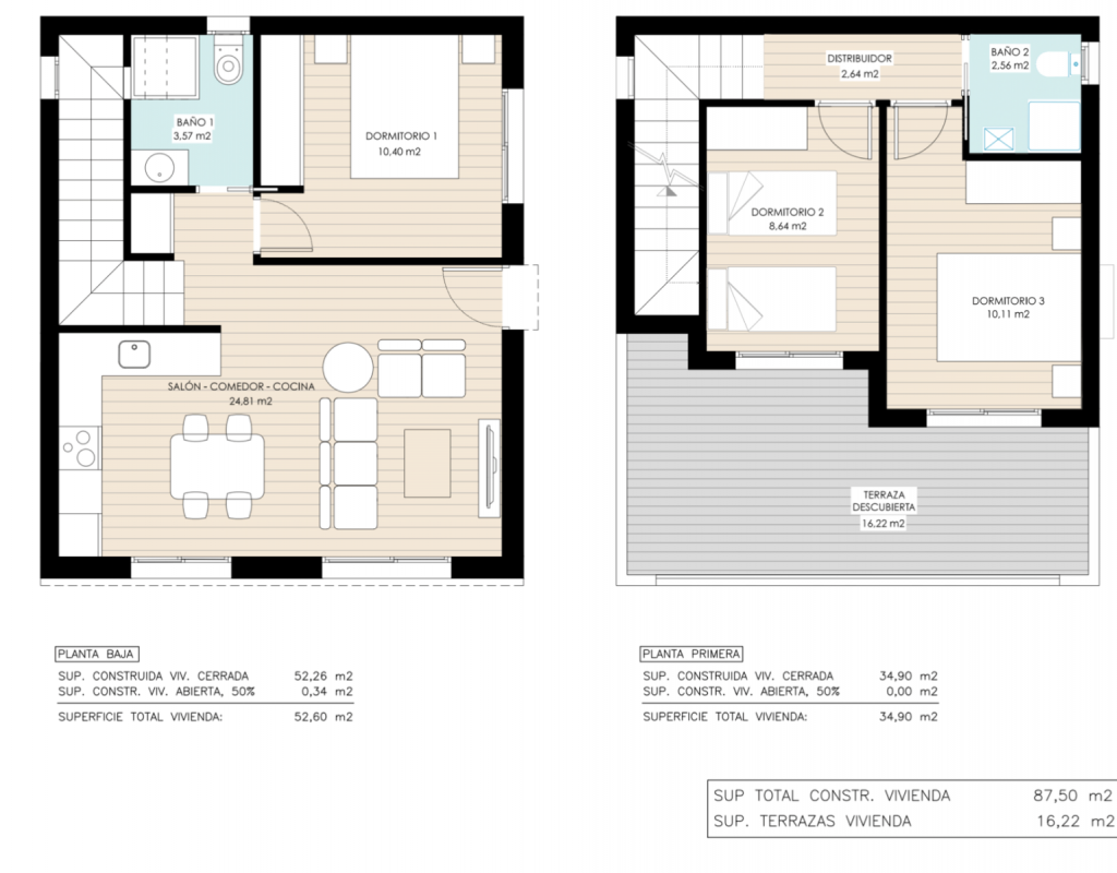 Con varios modelos y diseños disponibles en varios tamaños de casa y parcela; El modelo COSTA BLANCA ofrece 3 dormitorios, 2 baños, distribuidos en 2 niveles de aproximadamente 90 m2 y en una parcela privada de 140 m2 con solarium opcional y opciones con piscina.