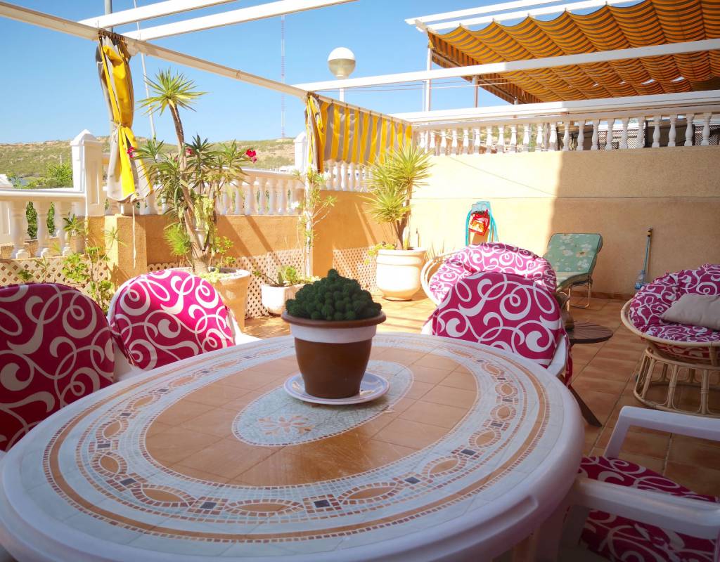 La propiedad consta de dos dormitorios, un baño, salón-comedor, con cocina independiente. Se puede acceder a la gran terraza de aproximadamente 40 m2 directamente desde la sala de estar o desde la cocina y tiene toldos (si lo considera necesario). Los amantes del sol pueden disfrutar del sol todo el día y todo el año.