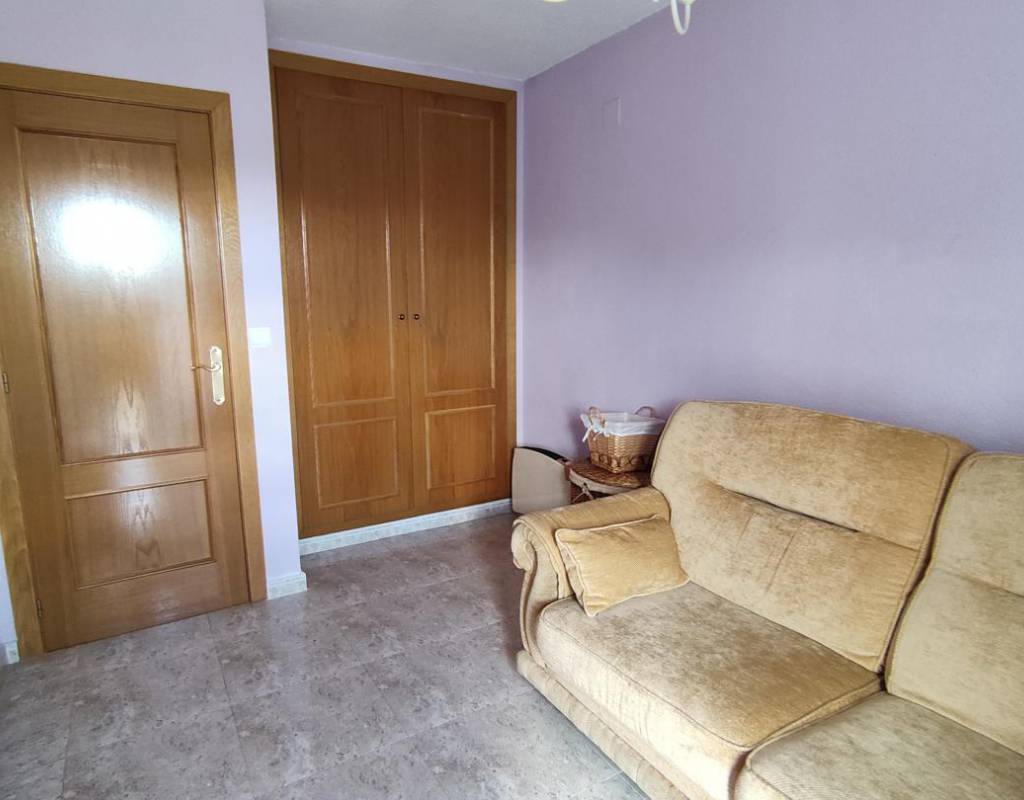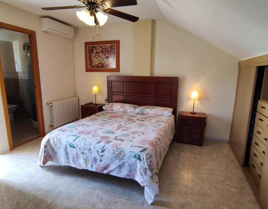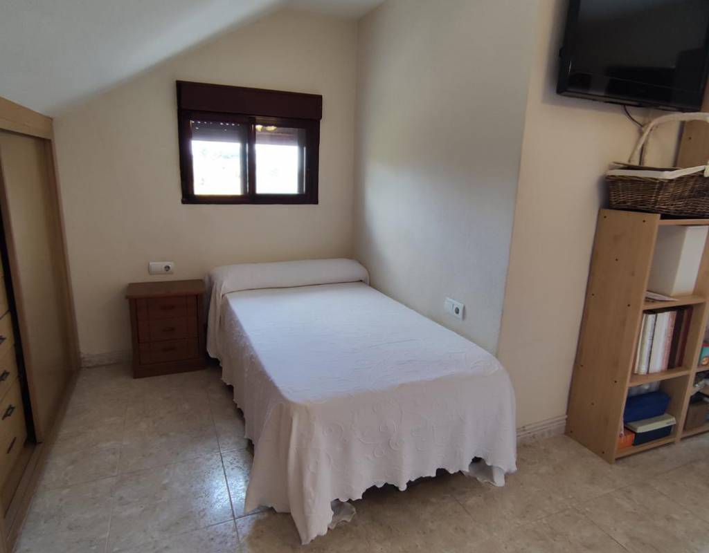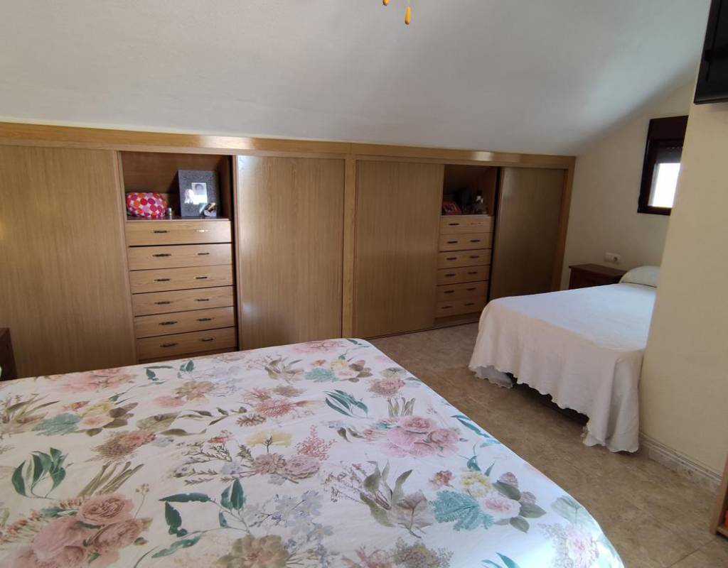 En planta segunda, zona aboardillada, doble dormitorio con librería y terraza solarium con pequeño cuarto de limpieza